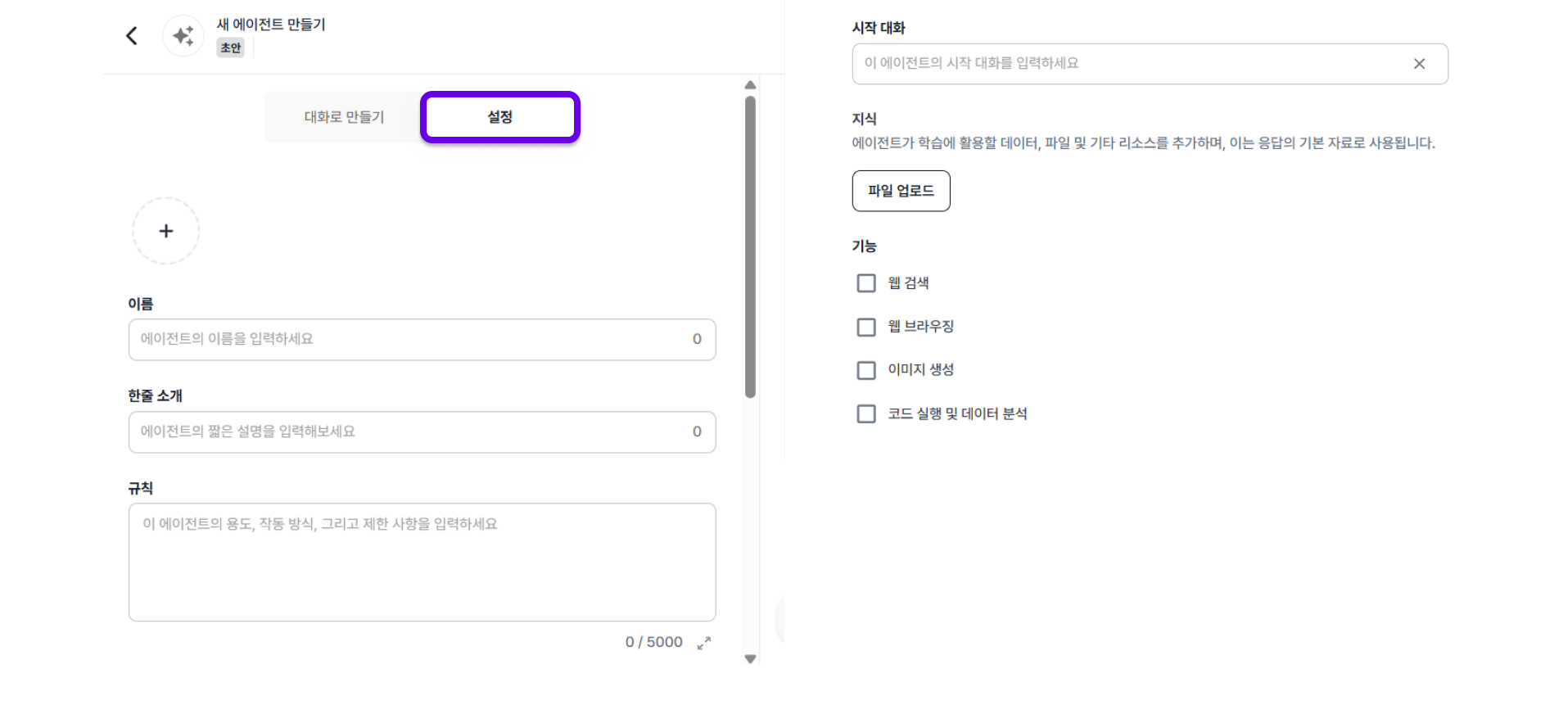 단, 지식과 기능은 사용자가 직접 업로드 및 선택해야 하는 값입니다.