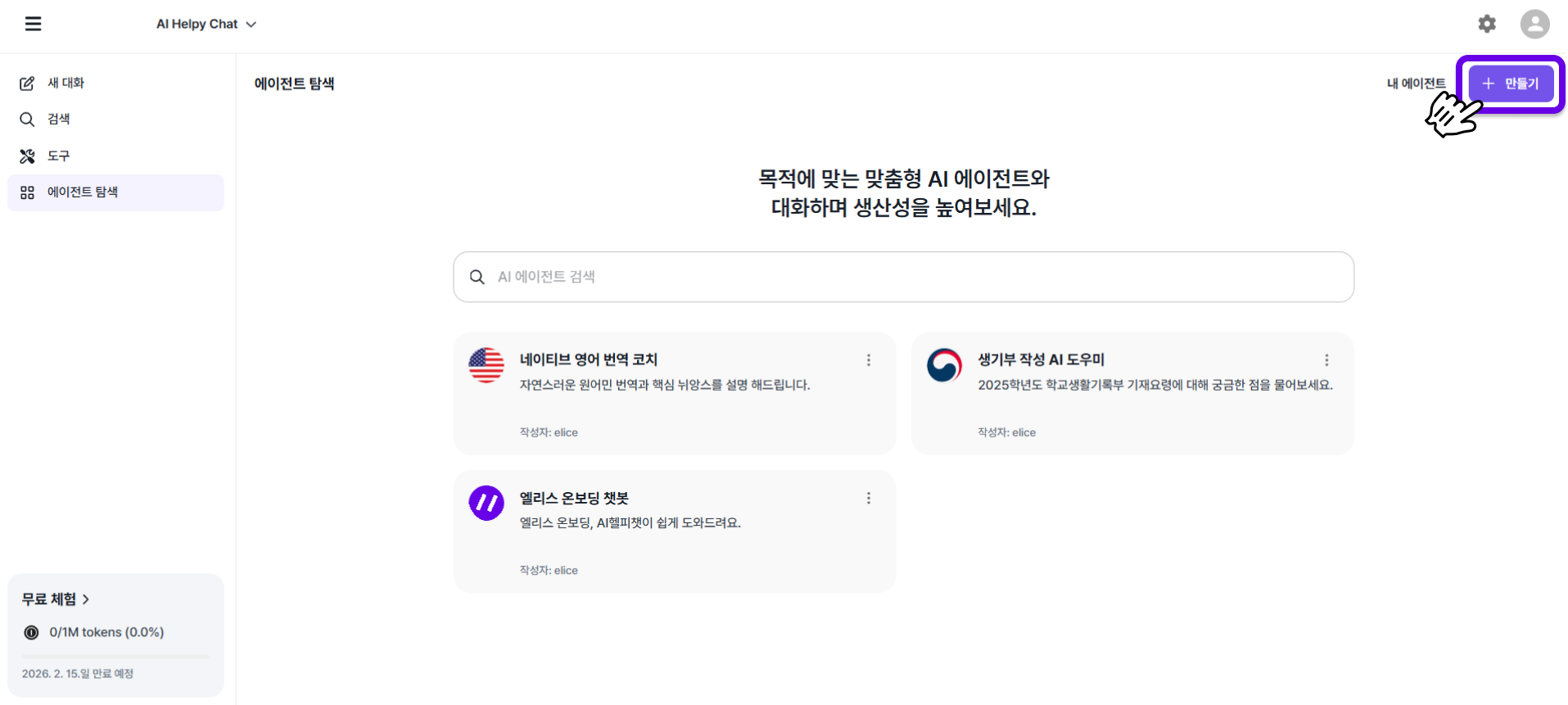 기관 구성원은 AI헬피챗에서 ‘에이전트 탐색’을 클릭하면
