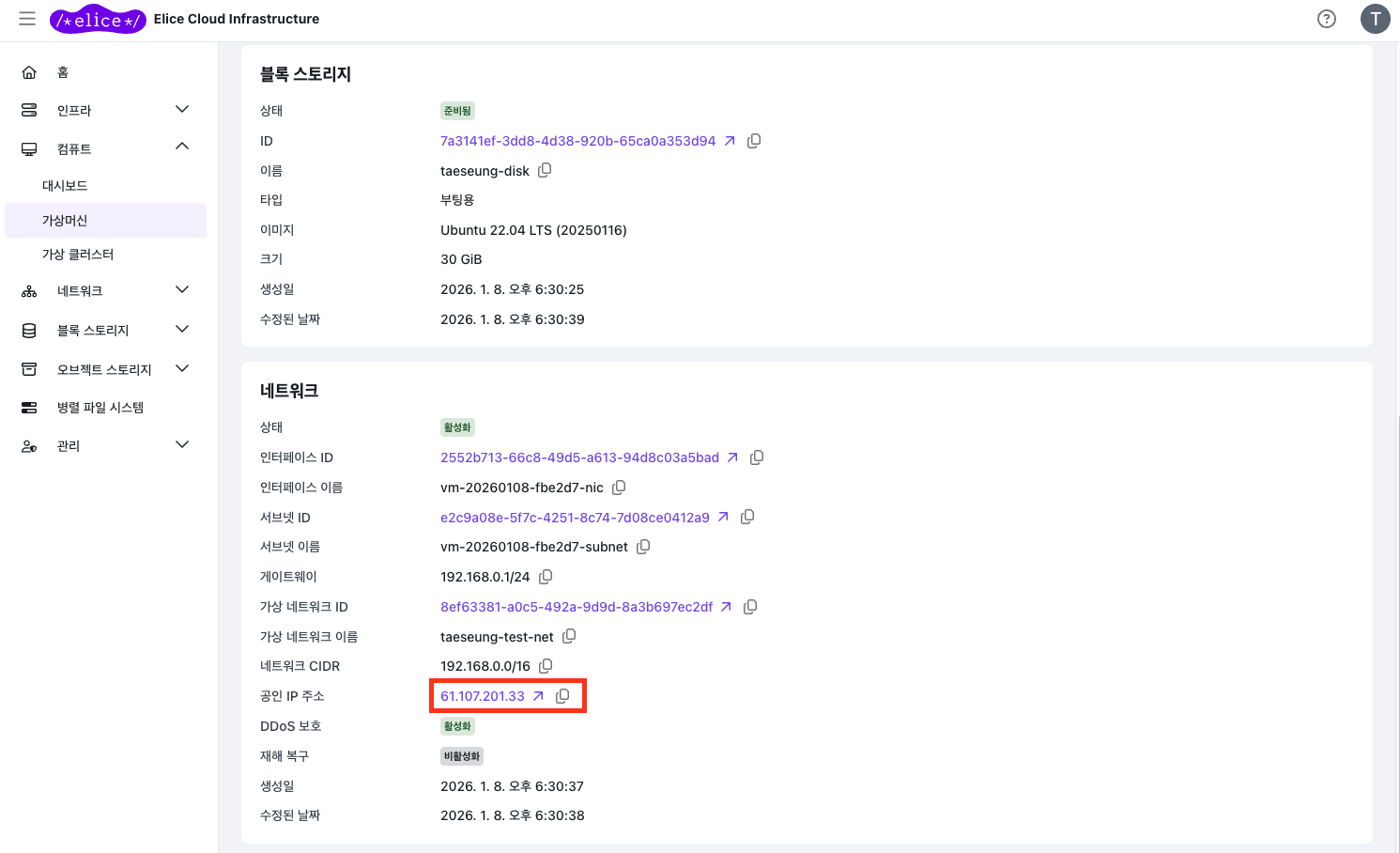 공인 IP 주소는 '가상머신 - 생성한 가상머신' 클릭 시 해당 페이지에서 확인할 수 있습니다.