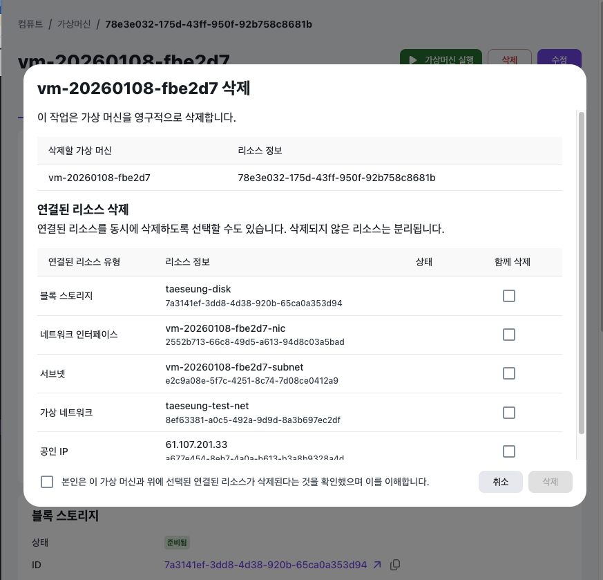 가상머신과 함께 생성된 연결된 리소스를 함께 삭제할지 선택할 수 있습니다.