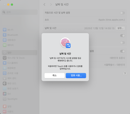 - '자동으로 시간 및 날짜 설정'을 비활성화 합니다. Touch ID 혹은 암호를 사용하여 설정 잠금을 해제할 수 있습니다.
