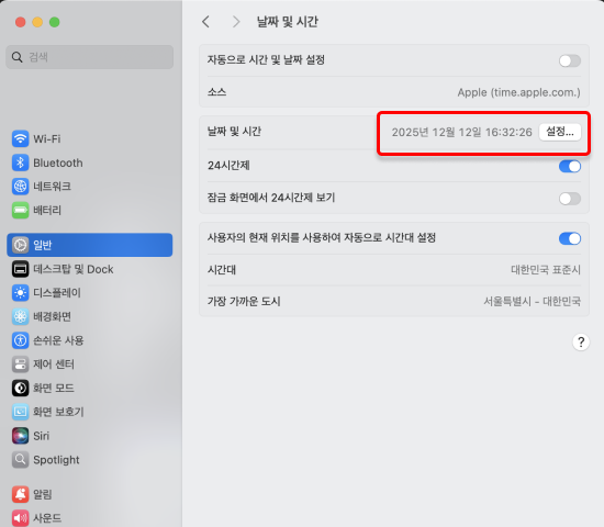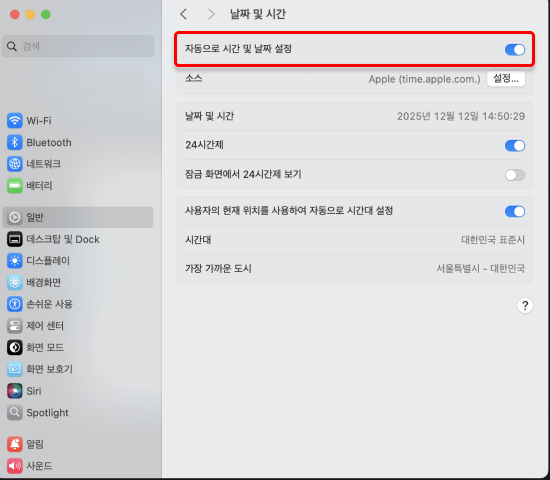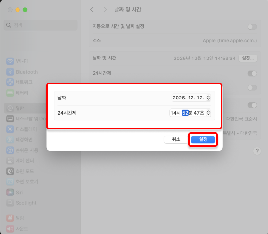 - 시스템 환경설정 중 '일반'의 '날짜 및 시간'을 선택합니다.