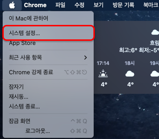 - 좌측 상 단의 Apple 메뉴를 클릭한 후 '시스템 설정'을 선택합니다.