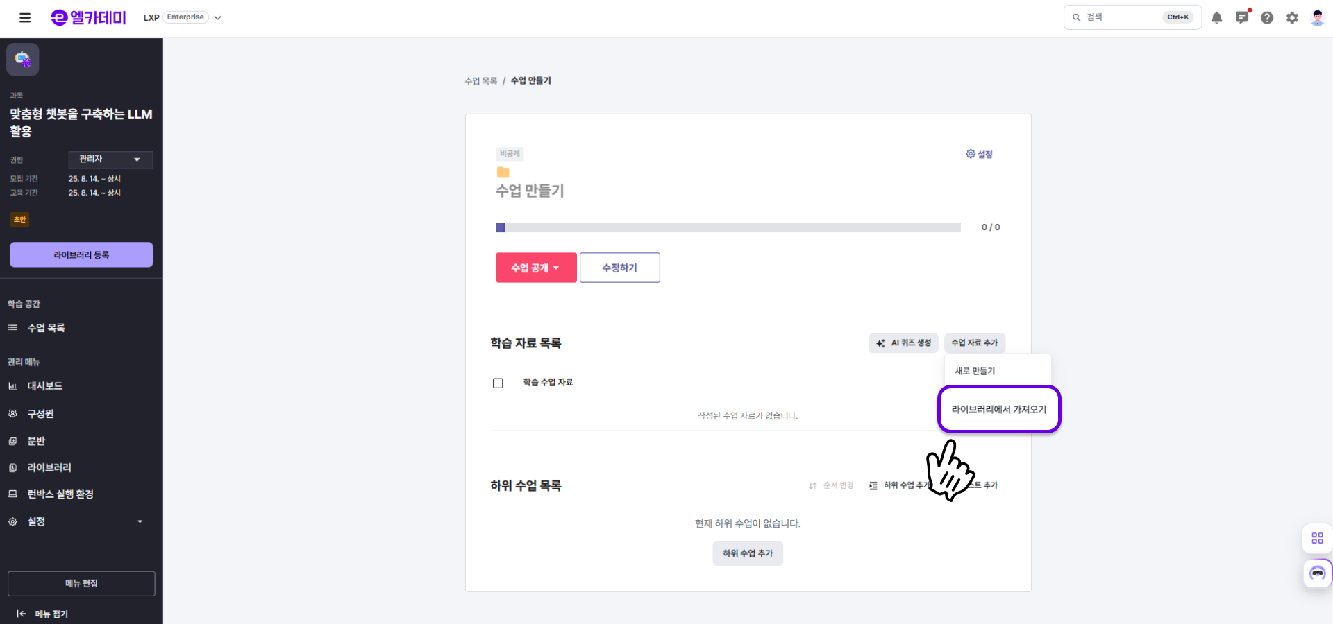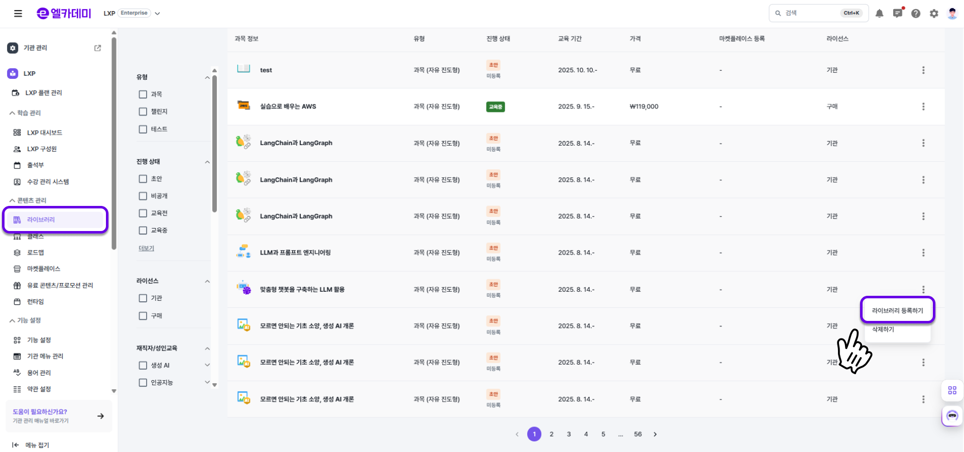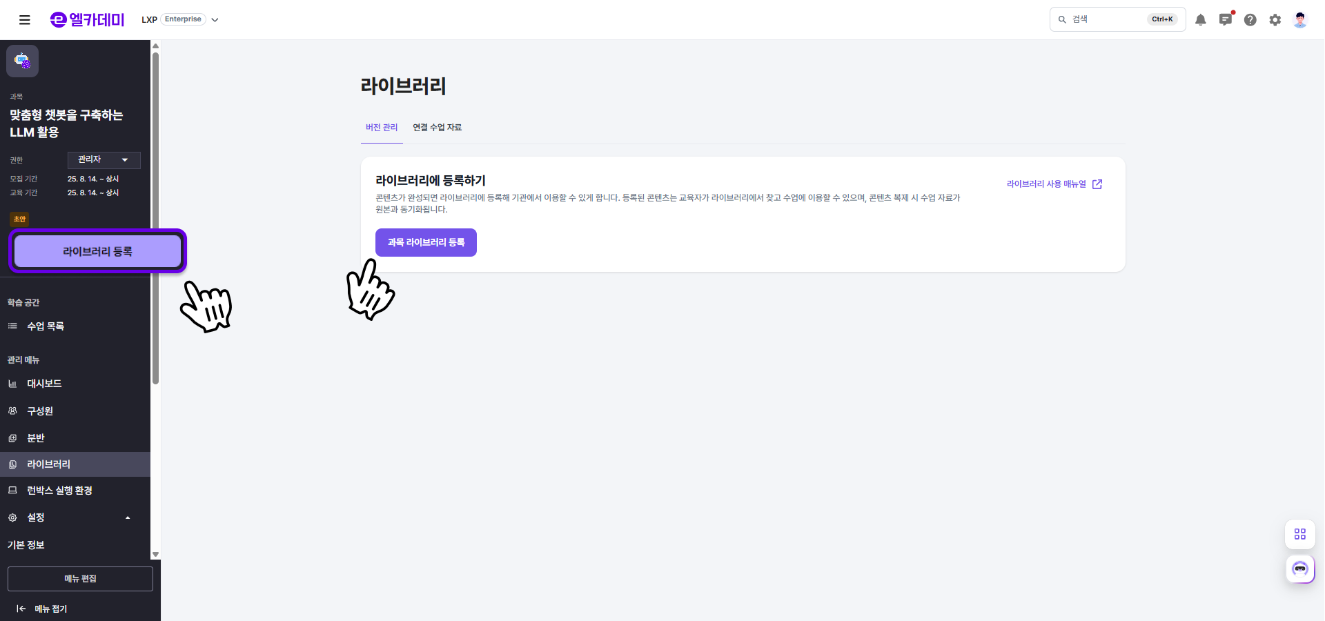 - LXP 설정 - [라이브러리] 메뉴에서 원하는 과목의 ( ⋮ ) 을 클릭해 [라이브러리 등록하기] 버튼을 선택합니다.
