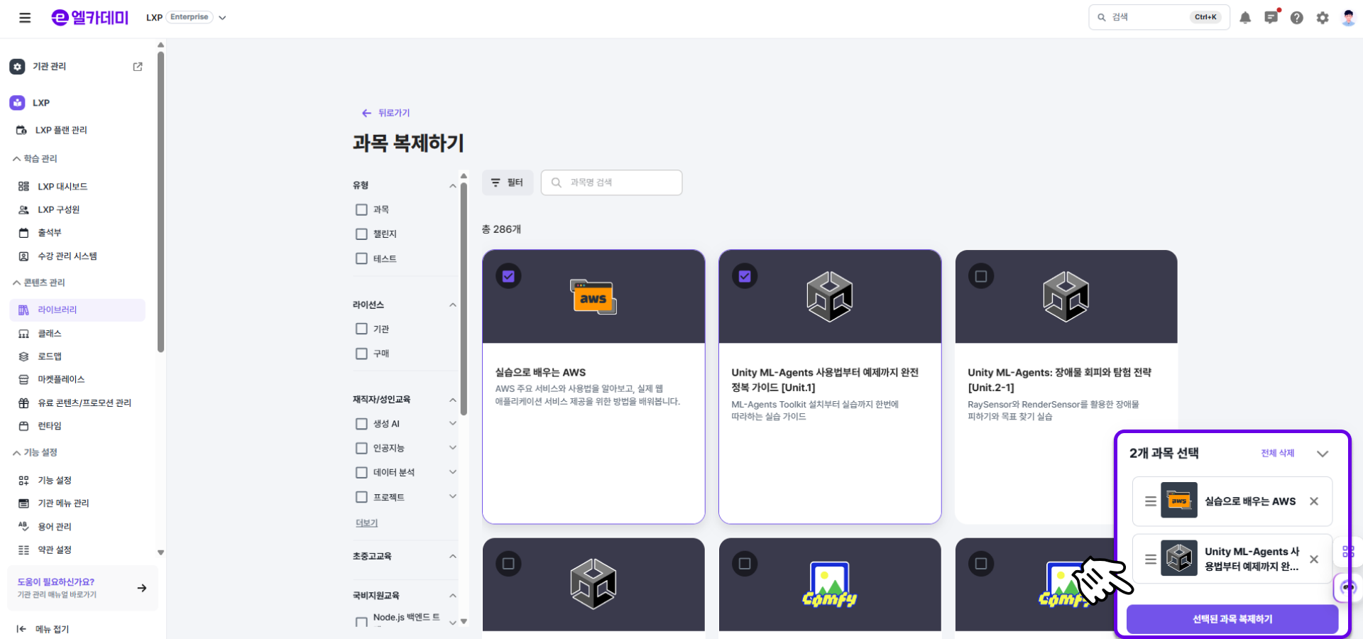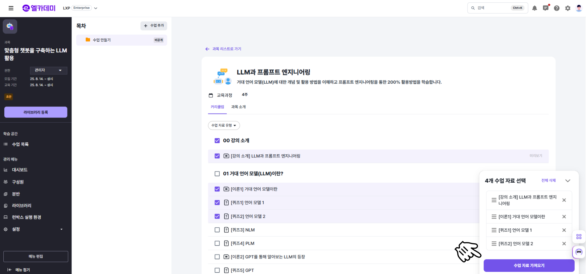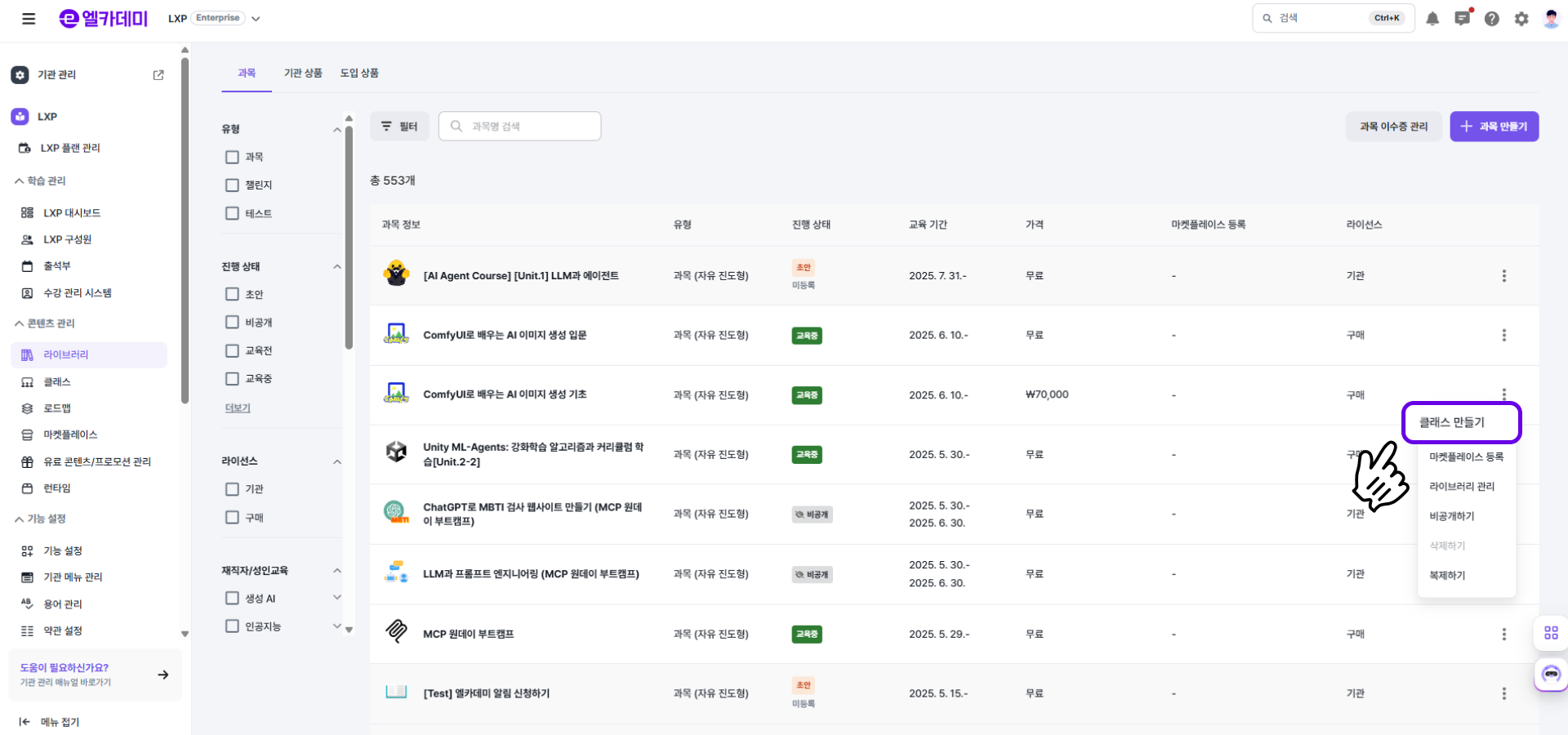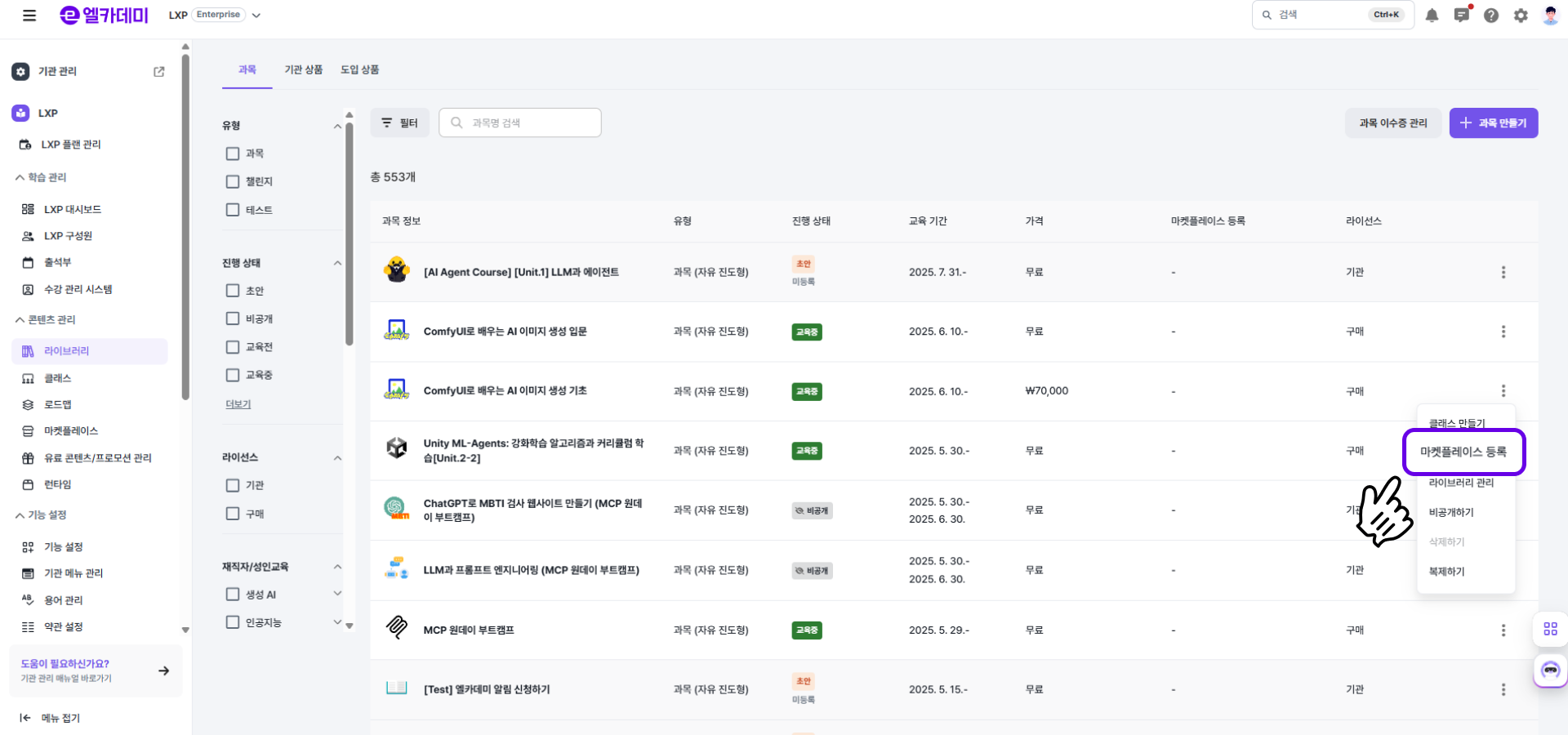 - LXP 설정 - [라이브러리] 메뉴에서 원하는 과목의 ( ⋮ ) 을 클릭해 [라이브러리 등록하기] 버튼을 선택합니다.