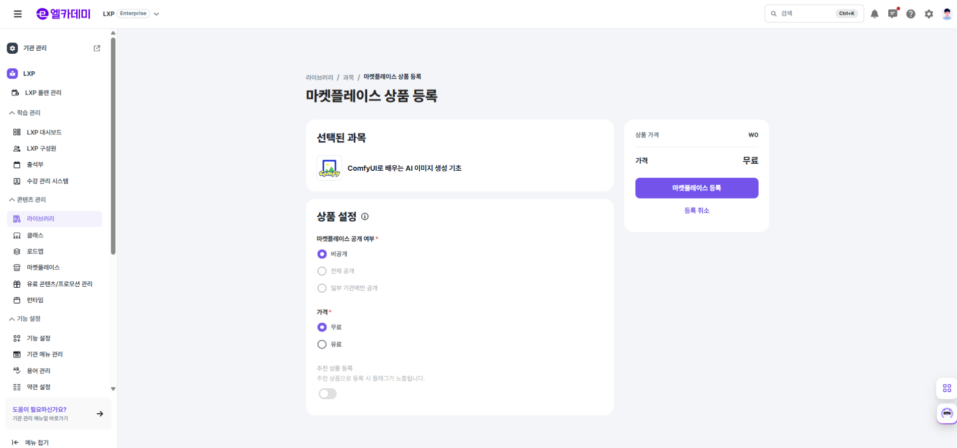 생성한 과목/수업자료는 다른 기관에서 도입할 수 있도록 마켓플레이스에 등록할 수 있습니다.