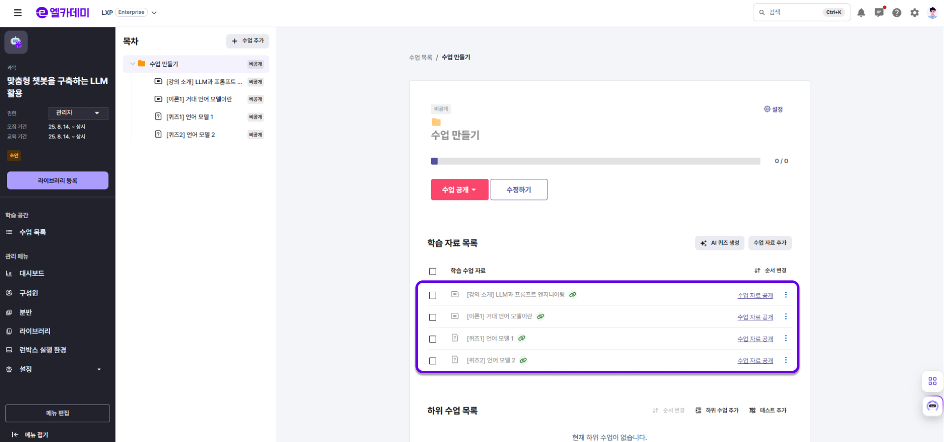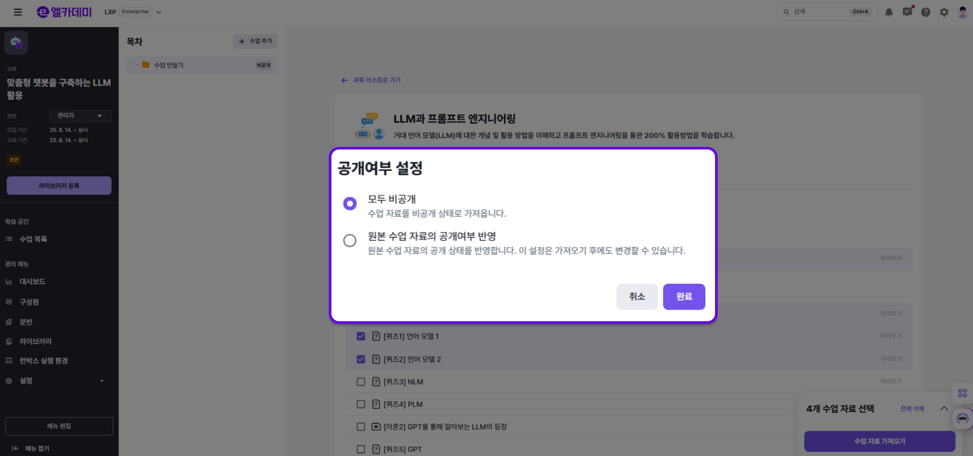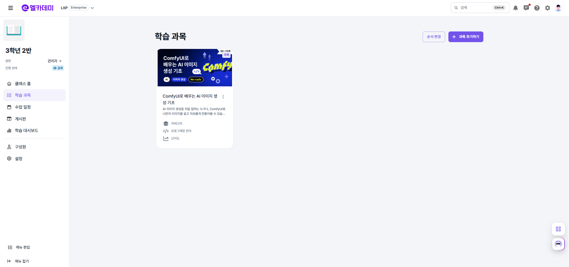 - 전체 공개 : 엘리스 LXP를 사용하는 모든 기관에서 과목을 확인할 수 있습니다.