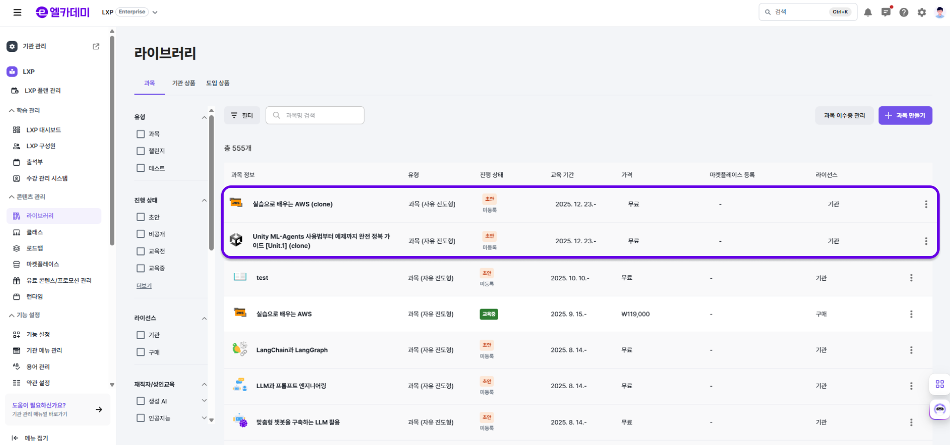 - 복제된 과목을 확인할 수 있습니다. (이때, 복제된 과목의 이름엔 clone이 추가되며, 상태는 초안 상태로 비공개 된 상태입니다.)