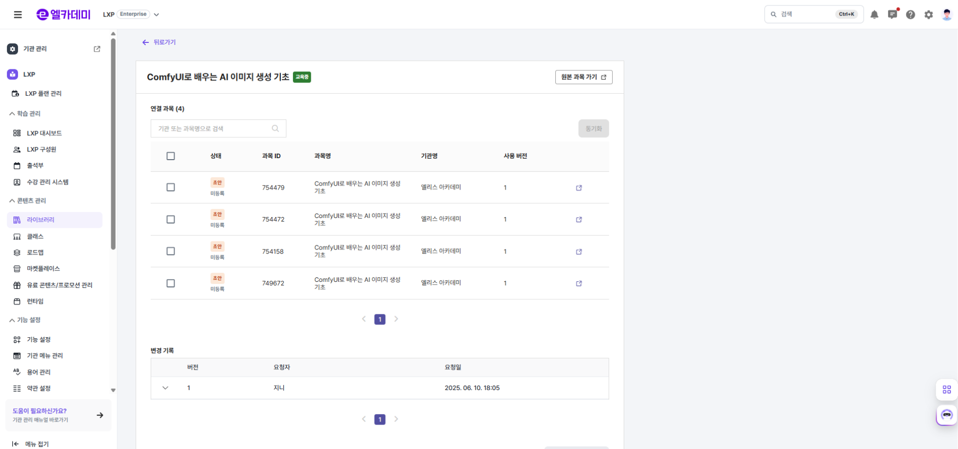| 변경 기록 | 라이브러리에 등록된 과목의 버전 변경 기록을 보여줍니다. |